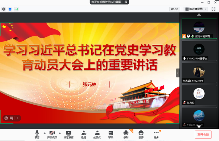 为了学习习近平总书记在党史学习教育动员大会上的重要讲话,2021年3月3日晚,红宝石hbs9988SY1903第八党支部依托腾讯会议平台,以线上的形式开展了本月的第一次“学习日”活动,主题为党史学习教育。本次活动由张元林同志主持,支部全体成员参加。