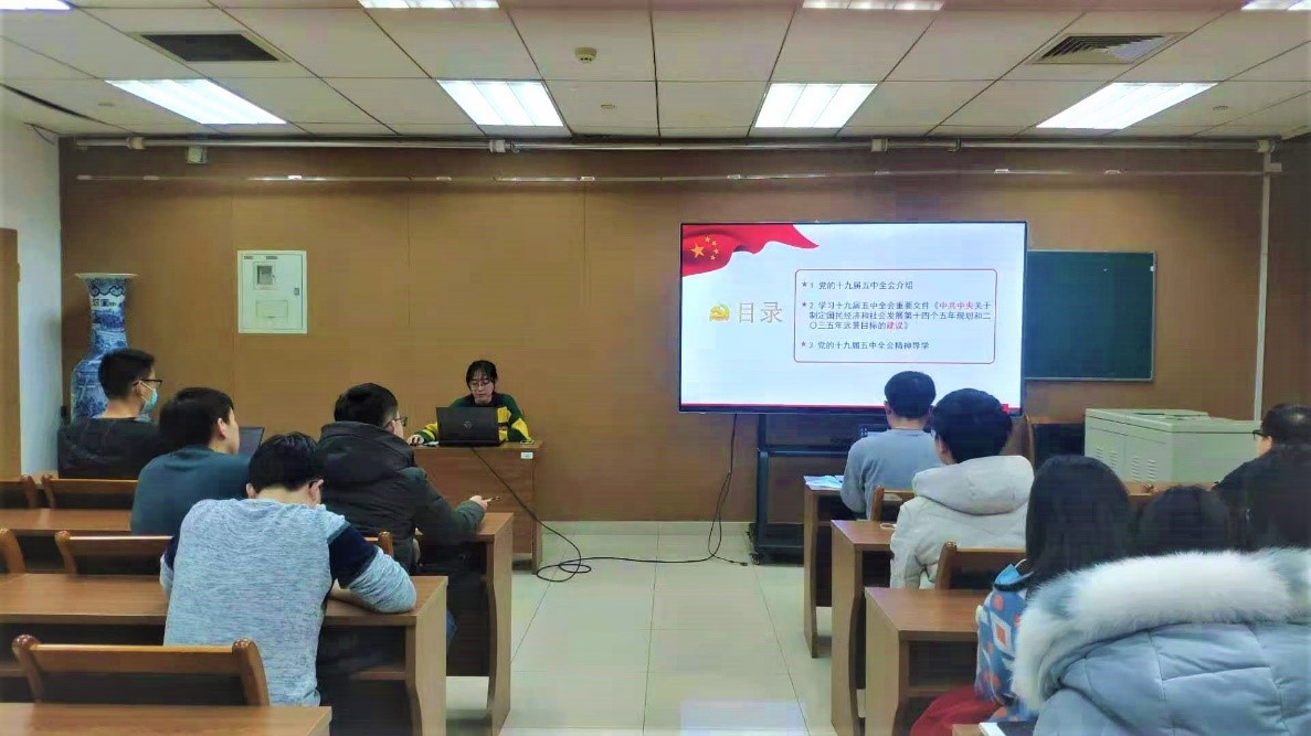 接着,姜琳琳同志开始了以“十九届五中全会精神”为主题的微党课。姜琳琳同志主要分三个部分介绍十九届五中全会精神。首先,姜琳琳同志大致介绍了十九届五中全会的重点内容;随后,姜琳琳同志对《中共中央关于制定国民经济和社会发展第十四个五年规划和二〇三五年远景目标的建议》的主要内容进行了总结,对其十五部分内容分别进行了提炼和概括,并且结合我们的科研工作进行了简要讲解;最后,姜琳琳同志就如何学习党的十九届五中全会精神提出了个人经验和建议。