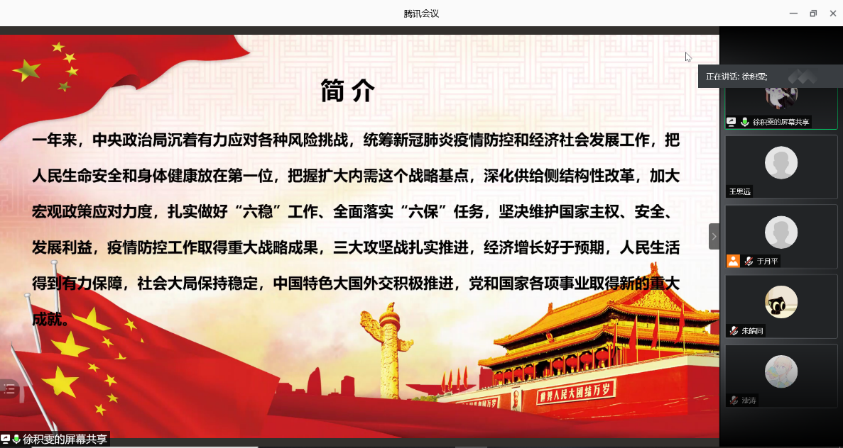 2020年12月16日,SY1903第六党支部在腾讯会议上,以学习习近平总书记在十九届五中全会上的重要讲话精神与曹淑敏书记针对十九届五中全会作宣讲报道为主题开展集中学习。会议由支部书记于月平主持,徐积雯同志作为主讲人进行了分享。会议应到11人,实到11人。