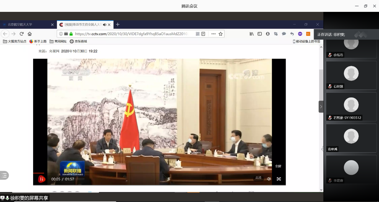 最后,徐积雯同志重点向大家分享学习了曹淑敏书记对于学习贯彻党的十九届五中全会的宣讲报告,曹淑敏书记从“全会背景和重大意义”、“规划《建议》主要内容及重点问题”和“贯彻落实全会精神的思考”等方面,对十九届五中全会精神作了系统阐述和深刻讲解。作为北航人,曹淑敏书记也对学校的未来发展进行了阐述,部署了学校贯彻落实五中全会精神的措施。