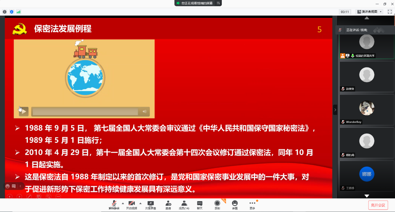 2020年12月16日下午三时,北京航空航天大学自动化与电气工程学院SY1903第一党支部通过腾讯会议线上开展了本周学习日活动。本次活动主要由钱瑞同志为党支部全体成员进行题为《提升依法治密水平、守护国家秘密》的报告。本次学习日活动应到人数15人,实到人数14人,请假1人。