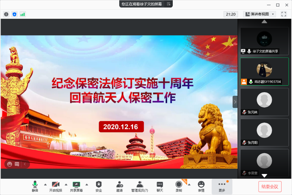 为纪念保密法修订实施十周年及我国航天事业创建64周年,学习保密法治建设历程,回首老一辈航天人的保密工作,提高党员的保密意识,2020年12月16日晚,红宝石hbs9988SY1903第八党支部依托腾讯会议平台,以线上的形式开展了本月的第二次“学习日”活动,主题为保密教育。本次活动由肖志颖同志主持,支部全体成员参加。