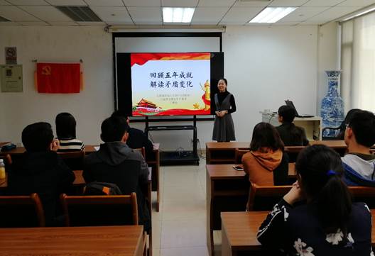 宣讲伊始,于秋漫同志介绍了十九大报告的基本内容和逻辑框架,告诉学生党员们要牢记中国共产党人的初心和使命——“为中国人民谋幸福,为中华民族谋复兴”。接着,于秋漫同志宣讲了十八大以来党和国家取得的重大成就。过去的五年我们向着中华民族伟大复兴的中国梦又迈近一步,经济、政治、文化、社会、生态等各个方面都成就斐然。透过十九大报告的三万多字,回望来时的路,五年来的成就无不让人振奋。于秋漫同志谈到了十九大报告中的高频词“新时代”,用“四梁八柱”说明了改革的根本性及对未来的影响。从C919等一系列大国重器所体现出的科技创新,到 “经济新常态”追求的高质量发展;从人均可支配收入的提高到一系列民生工程的实施……一件件事例,一串串数据,充分体现了五年来我国取得的巨大成就。于秋漫同志还和我们分享了促进教育公平,推进司法建设,全面从严治党等方面的具体实例。过去五年的成就不仅增强了中国人民的自豪感更提高了中国的国际地位和国际影响力,也门撤侨、“一带一路”以及中国在维护国际安全上做的贡献都深受国际赞许。
