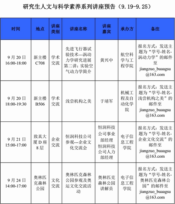 为提升我校研究生文化素养,培养研究生科学精神,促进研究生学术交流,营造具有传统与时代结合、人文与科学融合的研究生创新文化,党委研究生工作部于2016年3月启动我校研究生人文与科学素养提升平台建设。每周在校园网和研究生院官网上对近期即将举行的人文与科学素养讲座、报告或相关活动进行预告,欢迎感兴趣的同学积极参与。