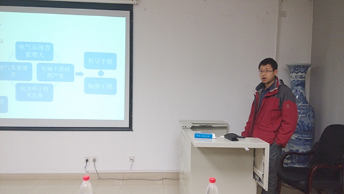 接下来做宣讲的是硕士研究生高帅,他的研究方向是电磁干扰建模与仿真。报告中,高帅博士主要讲解了“多电飞机电气负载的分类和建模、不同类负载间对电磁干扰特性的影响”等方面的内容,并就多电飞机电气负载引起的电磁干扰研究中所遇到的问题做了解释说明,同时为大家详细分析了负载电磁干扰特性的仿真结果。