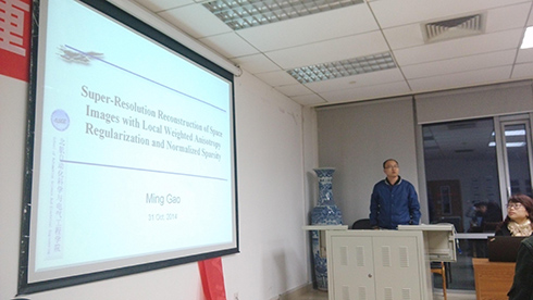 其次为大家讲解的是高明博士,他带来了题为《权重异性和标准稀疏的空间图像超分辨率重建》的报告。首先,他首先介绍了空间图像处理的原理,和提高分辨率的要求及难度,再提出权重异性和标准稀疏的空间图像超分辨率重建的具体方法,并通过对比,仿真以及实际测试方式作了具体展示,并对未来前景作了展望。