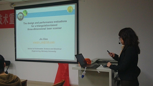 首先,肖瑾博士作了报告,她首先介绍了三维激光扫描仪设计的背景和深入研究的意义,并详细介绍了自己课题中新型三维激光扫描仪的设计原理,实验测试过程,性能评估,并介绍连续小波变换模极大值方法的误差补偿来提高激光测距精度和可靠性的方法。