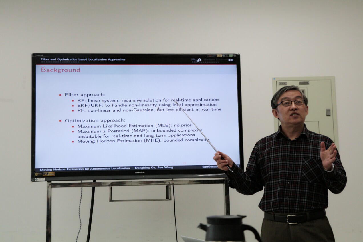 10月27日,英国埃塞克斯大学谷东兵教授在新主楼D639会议室为我校师生作了题为 “Moving Horizon Estimation for Autonomous Localization”的学术报告。本次报告会由自动化学院段海滨教授主持,吸引了来自全校信息类不同专业的40多名师生参加。谷东兵教授分别从滤波与优化的角度对估计方法进行了详细地讲解,并进一步阐述了基于滚动时域估计的自主定位方法。报告结束后,参加此次活动的师生们就感兴趣的前沿问题与谷教授进行了互动与交流,现场学术氛围热烈。