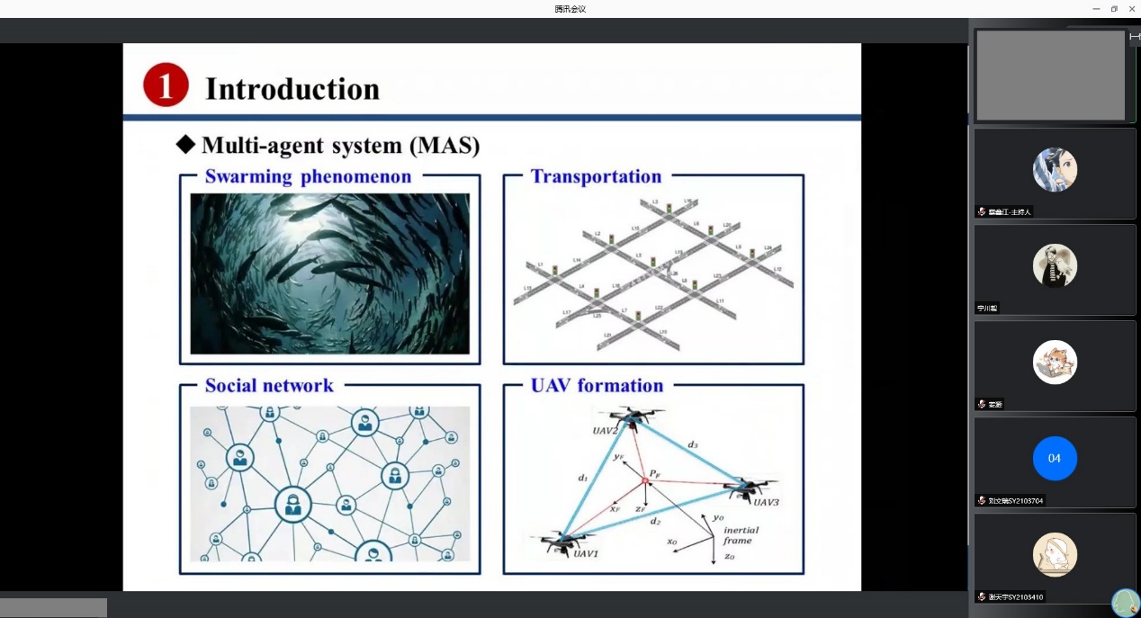 接下来进行分享的是红宝石hbs99882018级博士生张璟尧同学。他以“非线性多智能体网络系统在切换拓扑下的分布式迭代学习控制”为题,整合其发表在AUTOMATICA和IEEE TAC上的两篇论文研究内容进行汇报。张璟尧同学首先简要介绍了迭代学习控制的基本原理与优缺点,并以行进乐队为例,对迭代学习控制的对象——多智能体系统的相关特点与控制目标进行了阐述。随后引入代数图论、联合生成树等知识,设计分布式迭代学习控制协议,将全局Lipschitz条件放松为局部Lipschitz条件,通过理论推导、数值仿真等手段,回答了在具有切换拓扑的非线性多智能体网络系统中如何实现分布式迭代学习控制这一问题。