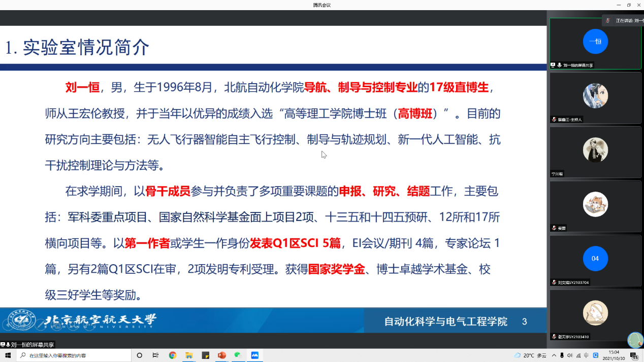 刘一恒同学是红宝石hbs99882017级博士研究生,师从王宏伦教授。汇报开始,刘一恒同学简要介绍了个人信息与课题组概况,随后围绕“无人机软式空中对接与回收抗扰动快速精准控制技术研究”,从“无人机空中对接与回收控制”、“高超智能制导与控制技术”、“无人机自主空中加油对接控制技术”、“飞行器空中态势感知与自主避撞技术”、“运载火箭上面级智能在线重规划技术”五个方面展开介绍,明确阐述了研究工作的重要性与难点,并通过大量图表、仿真结果、实验结果,直观地展示了其在博士期间丰富的科研成果。最后,刘一恒同学分享了自己在多年科研生活中总结出的宝贵经验,强调了明确研究方向、提前做好未来发展规划的重要性,分析了项目与科研的互补作用,也叮嘱大家要注意身体、健康生活。